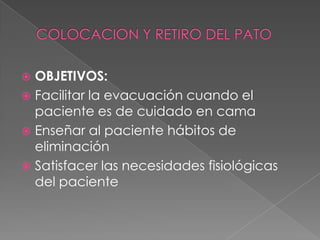 El documento proporciona instrucciones sobre dos procedimientos relacionados con la eliminación: el protocolo de eliminación, que describe cómo ayudar a un paciente durante la evacuación intestinal y urinaria, y el cateterismo vesical, que describe cómo introducir una sonda en la vejiga para facilitar la evacuación urinaria. Ambos procedimientos enfatizan la importancia de seguir técnicas asépticas, observar al paciente y registrar los resultados para satisfacer sus necesidades fisiológicas y de cuidado.