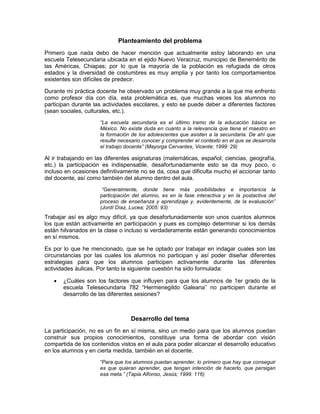 El documento presenta un protocolo de investigación sobre la baja participación de los alumnos en actividades escolares en una telesecundaria de Chiapas, relacionada con factores sociales y culturales. Se busca identificar las causas de esta problemática para diseñar estrategias que fomenten la participación activa de los estudiantes. La investigación combinará métodos cuantitativos y cualitativos para obtener un análisis integral de la situación educativa del grupo estudiado.