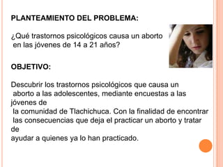 Este documento presenta un protocolo de investigación que examinará las consecuencias psicológicas del aborto en jóvenes de 14 a 21 años en la comunidad de Tlachichuca a través de encuestas. El objetivo es descubrir qué trastornos psicológicos causa el aborto, como depresión, remordimiento y enfermedades mentales, con el fin de ayudar a quienes ya lo han experimentado. La hipótesis es que estas consecuencias afectan a las jóvenes de la comunidad después de abortar.