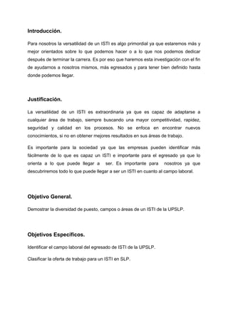 Este documento describe un protocolo de investigación sobre la versatilidad de un ingeniero industrial y tecnólogo (ISTI). El objetivo general es demostrar la diversidad de puestos y áreas en las que puede trabajar un ISTI egresado de la Universidad Politécnica de San Luis Potosí. Se revisarán testimonios de egresados, identificando el campo laboral e industrias como Cummins donde un ISTI puede desempeñarse. La hipótesis es que los egresados de ISTI tienen la posibilidad de ofertar puestos en