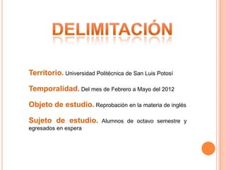 Este documento analiza las causas de reprobación en la materia de inglés entre alumnos de octavo semestre. Identifica tres factores principales: 1) El material didáctico no es adecuado, 2) El tipo de enseñanza no es dinámico, 3) Los estudiantes consideran el inglés como un idioma difícil de aprender. El documento describe la metodología de encuestas y análisis de datos para investigar este problema.
