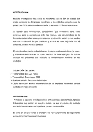 Este documento presenta un proyecto de investigación sobre el cumplimiento del reglamento ambiental en empresas industriales en San Luis Potosí, México. El proyecto analizará los reglamentos ambientales establecidos por el gobierno y por las propias empresas para comparar el compromiso de cada empresa con la protección del medio ambiente. Se utilizarán entrevistas y recolección de datos de sitios web para examinar los reglamentos y las campañas preventivas de las empresas.