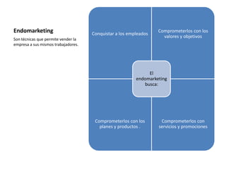 El documento describe el endomarketing, que son técnicas para promover la empresa entre sus propios empleados. El objetivo es comprometer a los empleados con los valores, objetivos, planes y productos de la empresa, así como con los servicios y promociones. Se necesitan reuniones para informar a los empleados y obtener su retroalimentación a través de un buzón de quejas. El endomarketing busca motivar a los empleados para reducir costos, rotación y conflictos, y mejorar la productividad, lealtad y satisfacción laboral