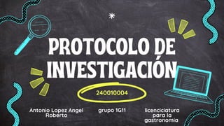 El documento describe el protocolo de investigación para la licenciatura en gastronomía, centrándose en la importancia de la titulación, las intervenciones educativas y el desarrollo de una tesina. Se detalla la estructura del protocolo, que incluye el planteamiento del problema, hipótesis, objetivos y metodología, así como la relevancia del estudio en el contexto de la gastronomía. Además, se resalta el papel crucial de los proctólogos de investigación en el avance médico relacionado con el trato gastrointestinal inferior.