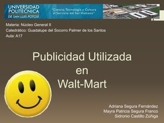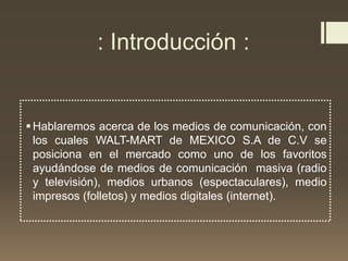 Este documento analiza los medios publicitarios que utiliza Walmart en México para posicionarse en el mercado. Identifica que los principales medios son la televisión, los folletos, internet y los espectaculares. Las encuestas muestran que los folletos son el medio más informativo para los clientes. Aunque la publicidad de Walmart no es extensa, logra tener cierto impacto que junto con los bajos precios y amplia variedad de productos permite que la empresa se posicione como una de las cadenas comerciales favoritas.