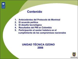 El documento resume los logros de Colombia en la implementación del Protocolo de Montreal, incluyendo la eliminación del consumo de CFCs y otras sustancias agotadoras de la capa de ozono. También describe oportunidades para que el sector hotelero participe mediante la compra responsable de equipos sin estas sustancias, la certificación de técnicos y la implementación de estrategias de eficiencia energética y gestión ambiental.