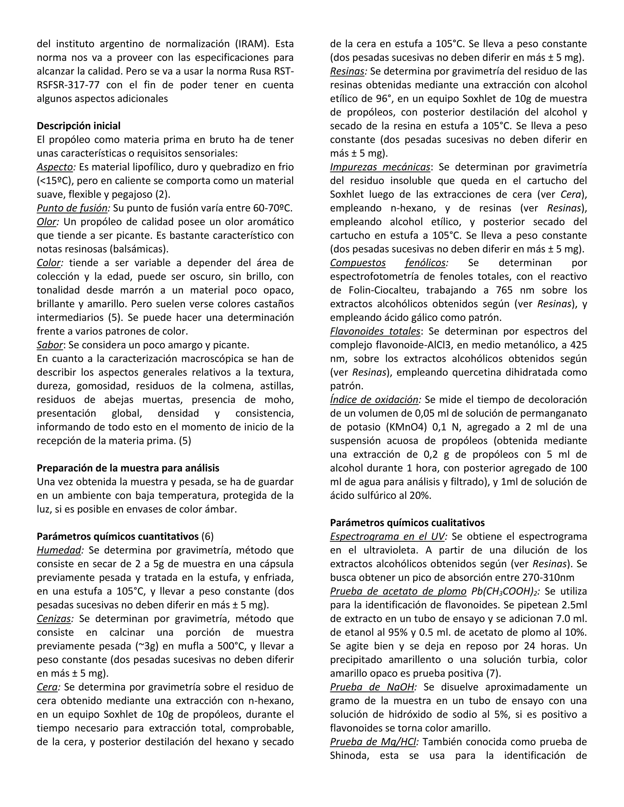 Este documento presenta un protocolo de control de calidad para propóleo. Describe brevemente la composición y usos del propóleo, así como los parámetros químicos cuantitativos y cualitativos que se evaluarán, incluyendo humedad, cenizas, cera, resinas, compuestos fenólicos, flavonoides y pruebas cualitativas como la de acetato de plomo. El objetivo es establecer especificaciones para asegurar la calidad y efectividad del propóleo de manera consistente entre lotes.
