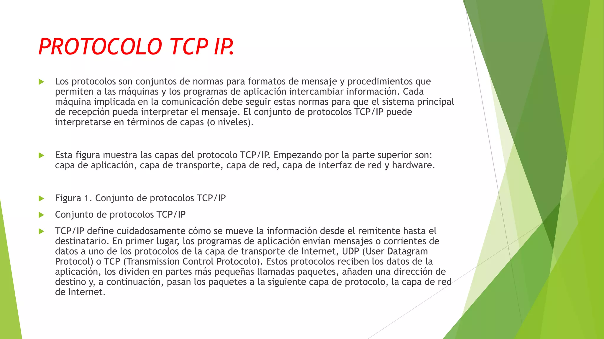 El documento describe el protocolo TCP/IP, incluyendo sus capas (aplicación, transporte, red e interfaz), cómo mueve la información entre remitente y destinatario a través de paquetes, y sus ventajas como ser diseñado para enrutar con alta fiabilidad y compatibilidad global.