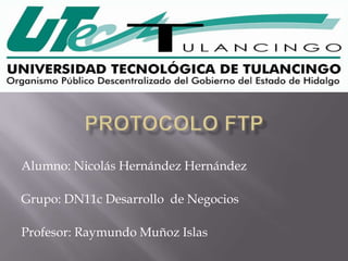 El documento resume la información de un estudiante llamado Nicolás Hernández Hernández que pertenece al grupo DN11c de Desarrollo de Negocios y tiene como profesor a Raymundo Muñoz Islas. También describe brevemente el protocolo FTP, incluyendo su historia desde 1971 y objetivos principales como permitir compartir archivos entre equipos remotos e independencia entre sistemas de archivos.