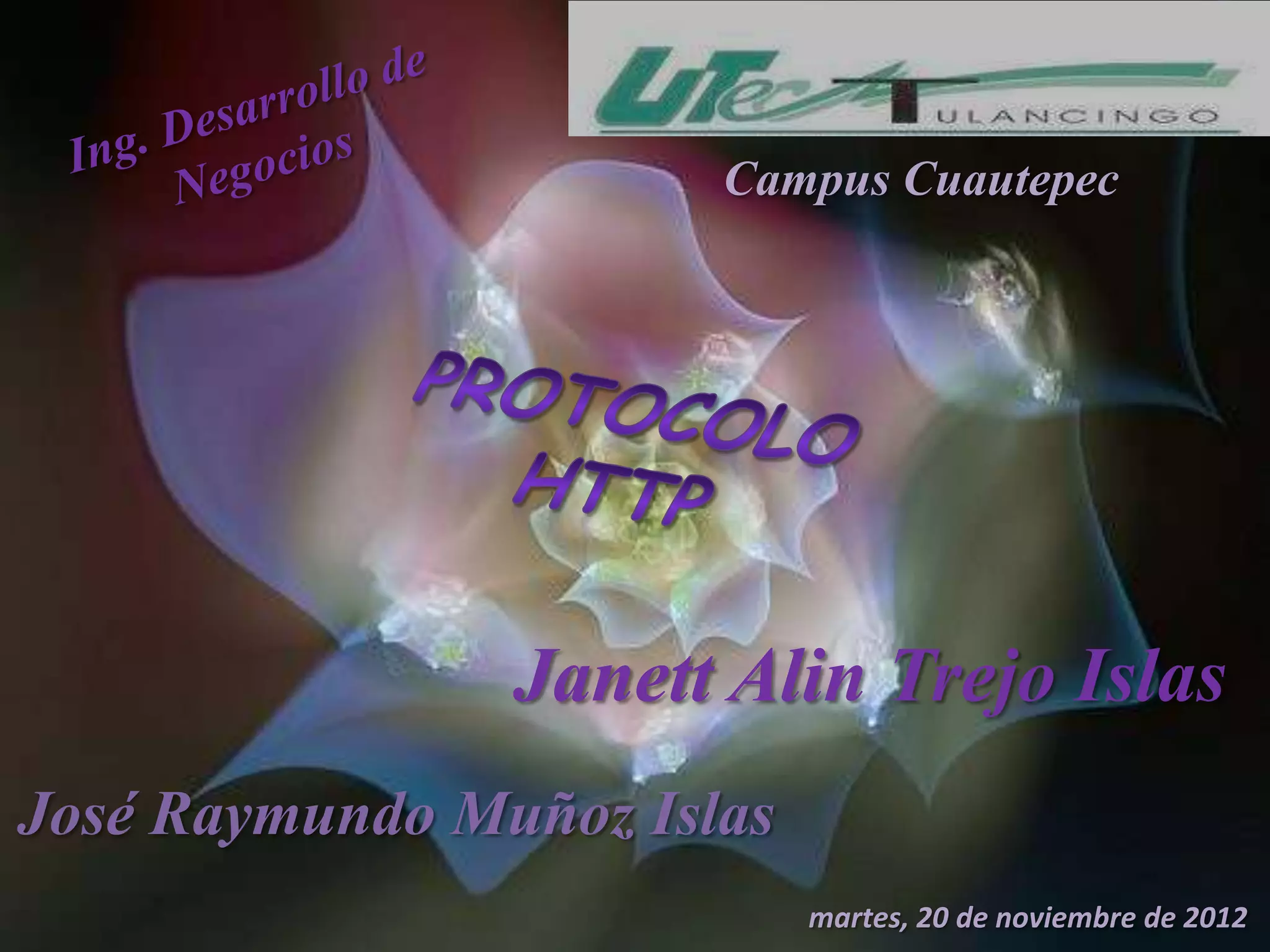 El documento habla sobre el Campus Cuautepec. Menciona los nombres Janett Alin Trejo Islas y José Raymundo Muñoz Islas, así como la fecha del 20 de noviembre de 2012. También incluye enlaces a sitios web sobre protocolo HTTP.