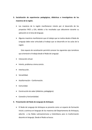 Este documento resume el I Taller Regional para la Transformación de la Formación Docente en Lenguaje que tuvo lugar en Ciudadela El Lago, Sonsón. El taller buscó socializar iniciativas de profesores y generar diálogos colaborativos para construir conocimiento en lenguaje. Incluyó presentaciones, ejercicios corporales, socialización de experiencias pedagógicas, y un taller sobre problemas en la enseñanza del lenguaje. Los asistentes discutieron proyectos exitosos y cómo mejorar la articulación entre la formación y