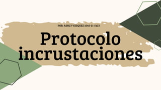 Este documento describe los protocolos y procedimientos para realizar incrustaciones de composite. Incluye las etapas de preparación dental, impresiones, prueba de la incrustación, cementado y terminación. La preparación dental involucra el diagnóstico, diseño de la cavidad y remoción de tejidos defectuosos. Luego se toman impresiones y se colocan provisionales. La incrustación se prueba y ajusta antes del cementado con adhesivo. Finalmente, se pulen y revisan oclusión y estética.