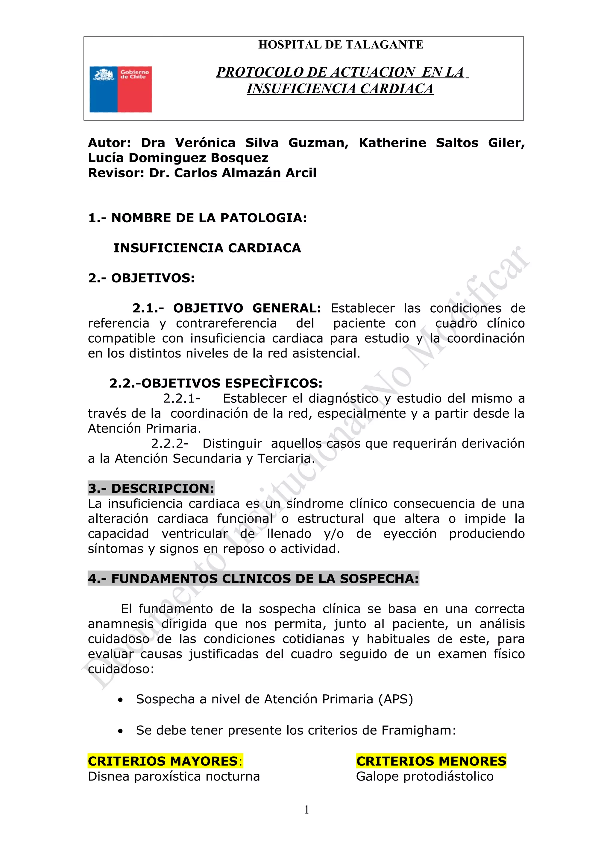 Este documento presenta un protocolo de actuación para el Hospital de Talagante sobre la insuficiencia cardíaca. Establece objetivos generales como diagnosticar y estudiar la insuficiencia cardíaca a través de la coordinación de la red asistencial, especialmente desde la atención primaria. Describe la insuficiencia cardíaca y ofrece criterios clínicos para su sospecha, incluyendo los criterios de Framingham. Finalmente, detalla los criterios para la referencia a especialidades como cardiología.