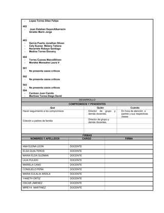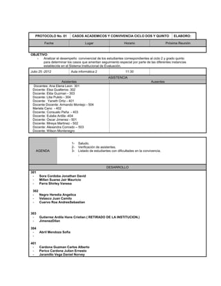 El documento resume las discusiones de una reunión sobre casos académicos y de convivencia de estudiantes de los ciclos 2 y 5. La reunión analizó los estudiantes con dificultades de convivencia e incluyó una lista de estudiantes problemáticos por docente. Los compromisos fueron hacer seguimiento a los casos y citar a los padres. La reunión contó con la asistencia de 12 docentes.