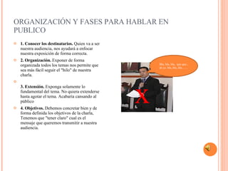 El documento proporciona instrucciones sobre cómo planear y dar presentaciones orales efectivas. Recomienda conocer a la audiencia, organizar el contenido por temas principales, mantener la brevedad, definir objetivos claros y usar ayudas visuales moderadas. Además, aconseja hablar con volumen y claridad, mantener la naturalidad, realizar pausas breves y evitar risas forzadas. Distingue entre discursos en eventos y presentaciones más extensas, e incluye consejos sobre cómo manejar imprevistos durante la presentación.