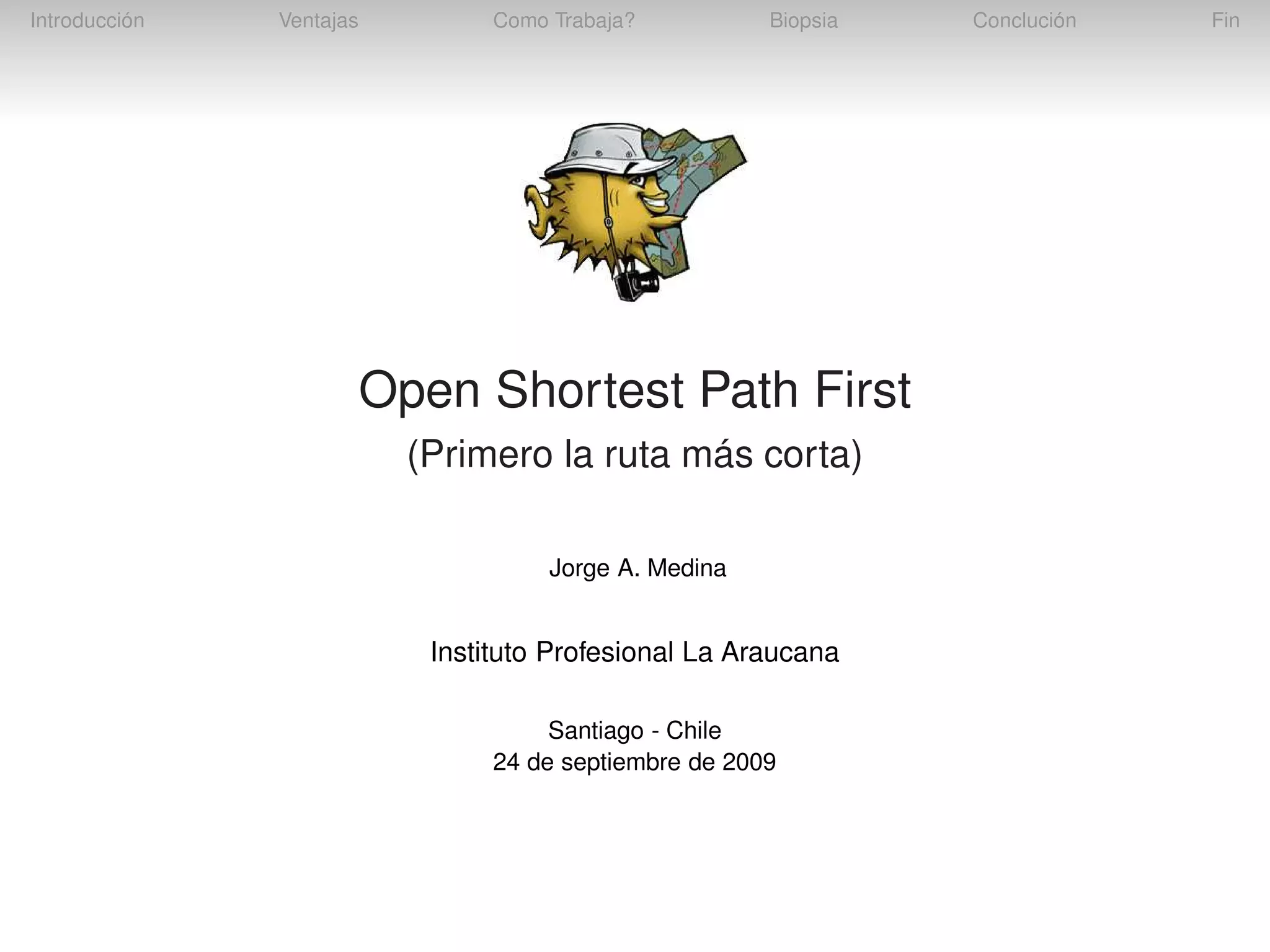 OSPF es un protocolo de enrutamiento interno que mejora sobre RIP al usar estados de enlace en lugar de vectores de distancia, lo que le permite converger más rápido. Calcula la ruta más corta usando el algoritmo de Dijkstra y permite dividir las redes grandes en áreas. Puede implementarse de forma abierta usando proyectos como OpenOSPFD.