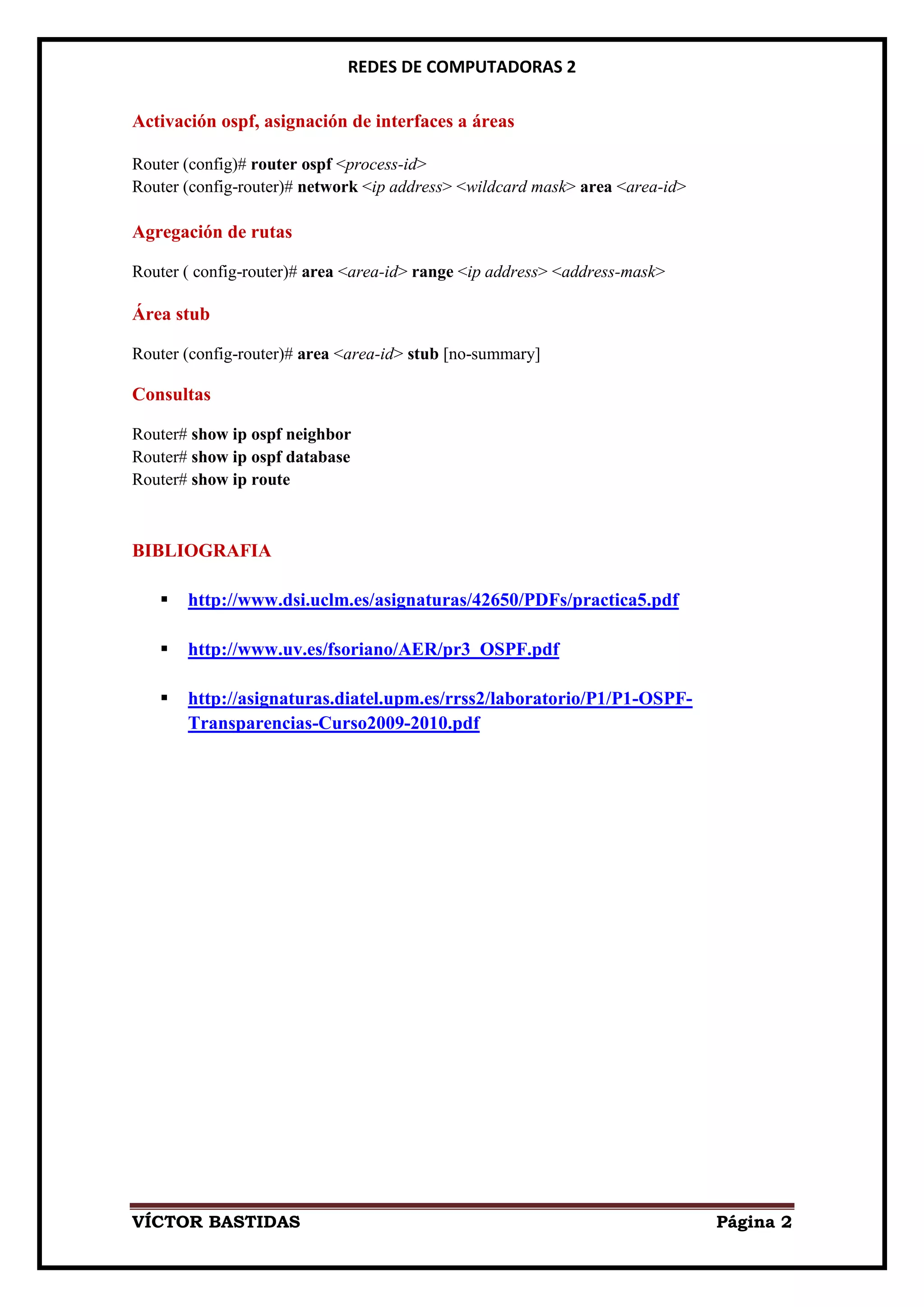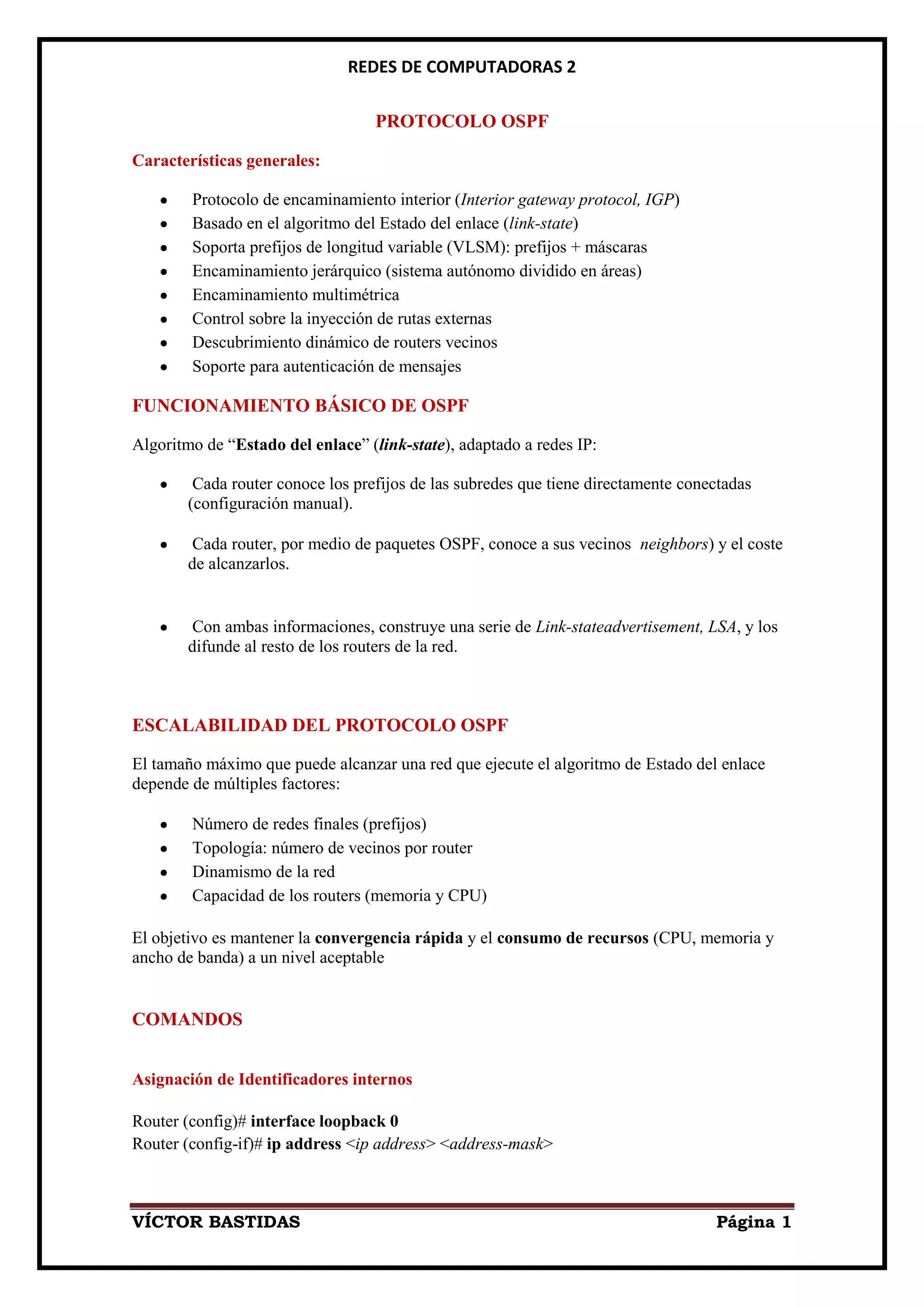 El documento describe el protocolo OSPF (Open Shortest Path First). OSPF es un protocolo de encaminamiento interior basado en el algoritmo del estado del enlace. Utiliza prefijos de longitud variable y soporta encaminamiento jerárquico mediante la división de una red autónoma en áreas. Los routers aprenden sobre la topología de red al intercambiar paquetes OSPF que contienen información sobre enlaces y costes.
