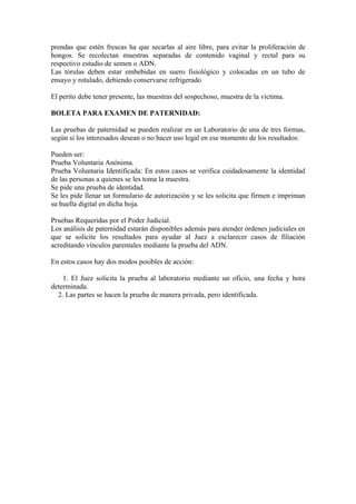 Este documento presenta varios protocolos y formularios relacionados con la cadena de custodia de evidencia en casos de delitos sexuales. Incluye formularios para el consentimiento de exámenes médicos, registros de muestras tomadas y su envío a laboratorio, así como documentos para realizar pruebas de paternidad. El objetivo general es establecer procedimientos para asegurar la correcta recolección, manejo y preservación de la evidencia para su uso en las investigaciones legales.