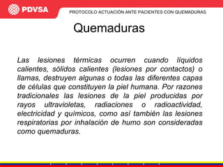 El documento presenta un protocolo para el tratamiento de pacientes con quemaduras. Describe las características de las quemaduras, su clasificación según profundidad y extensión, y criterios para hospitalización. Explica el manejo en sala de emergencias, incluyendo hidratación, analgésicos y tratamiento tópico. También cubre el manejo quirúrgico de quemaduras superficiales, intermedias y profundas, así como la excisión, cobertura e injertos.