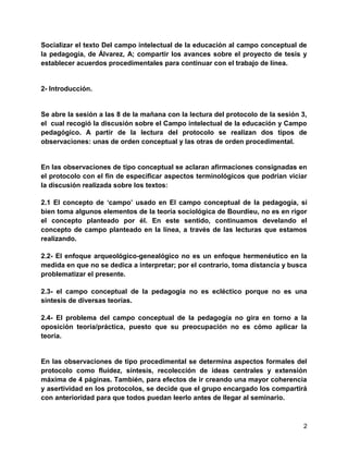 Este documento resume el seminario de la línea de investigación en educación del programa de maestría en desarrollo educativo y social de la UPN. Se discutieron los avances de tres grupos de investigación sobre formación para el trabajo, experiencias docentes y educación y niñez. También se debatió el concepto de campo intelectual de la educación propuesto por Álvarez y se establecieron acuerdos sobre el formato de los protocolos.