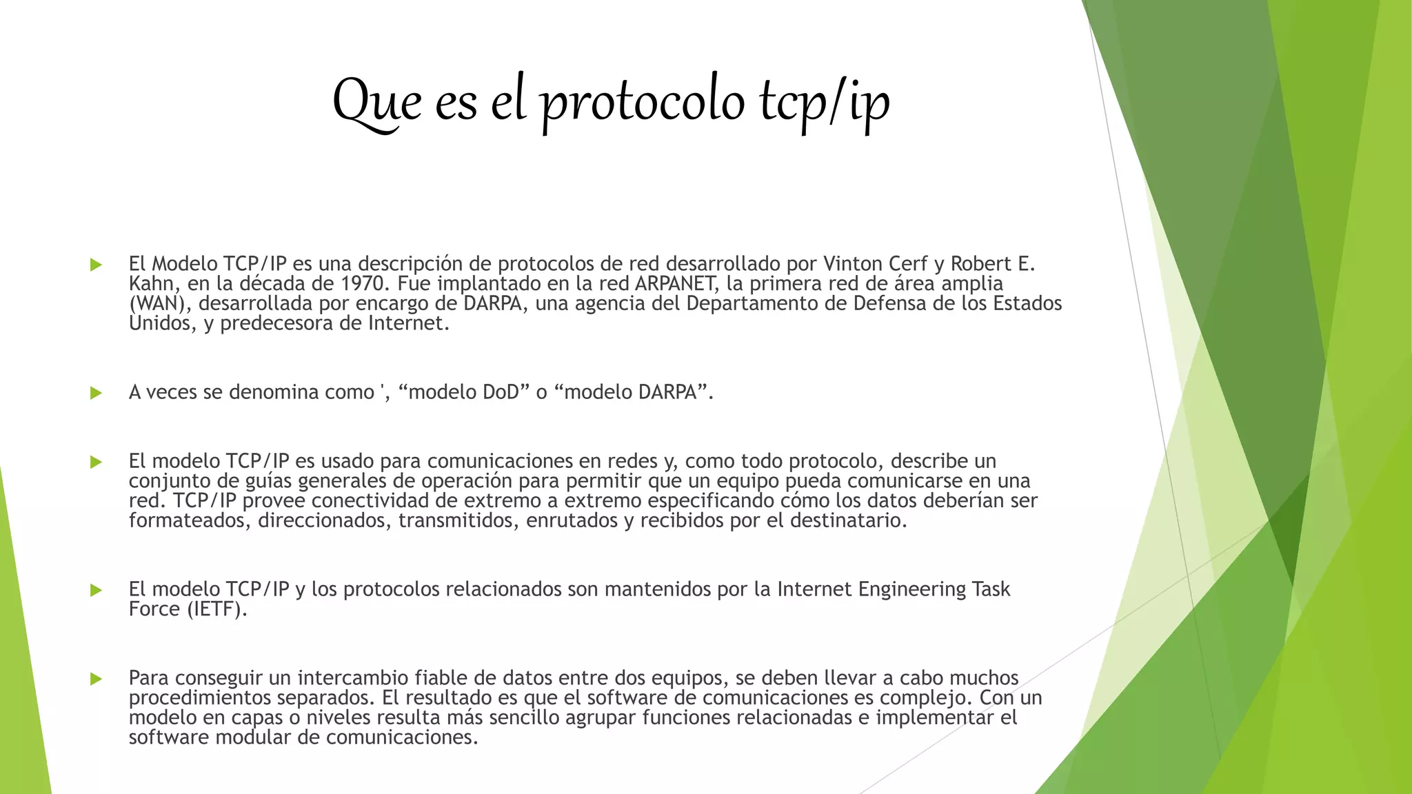 El documento describe los protocolos TCP/IP, incluyendo sus capas (Internet, Transporte y Aplicación), protocolos (TCP e IP) y sus funciones. TCP garantiza la entrega confiable de datos entre dos equipos a través de conexiones, mientras que IP ofrece un servicio de distribución de paquetes de forma no fiable y orientada a conexión entre redes.