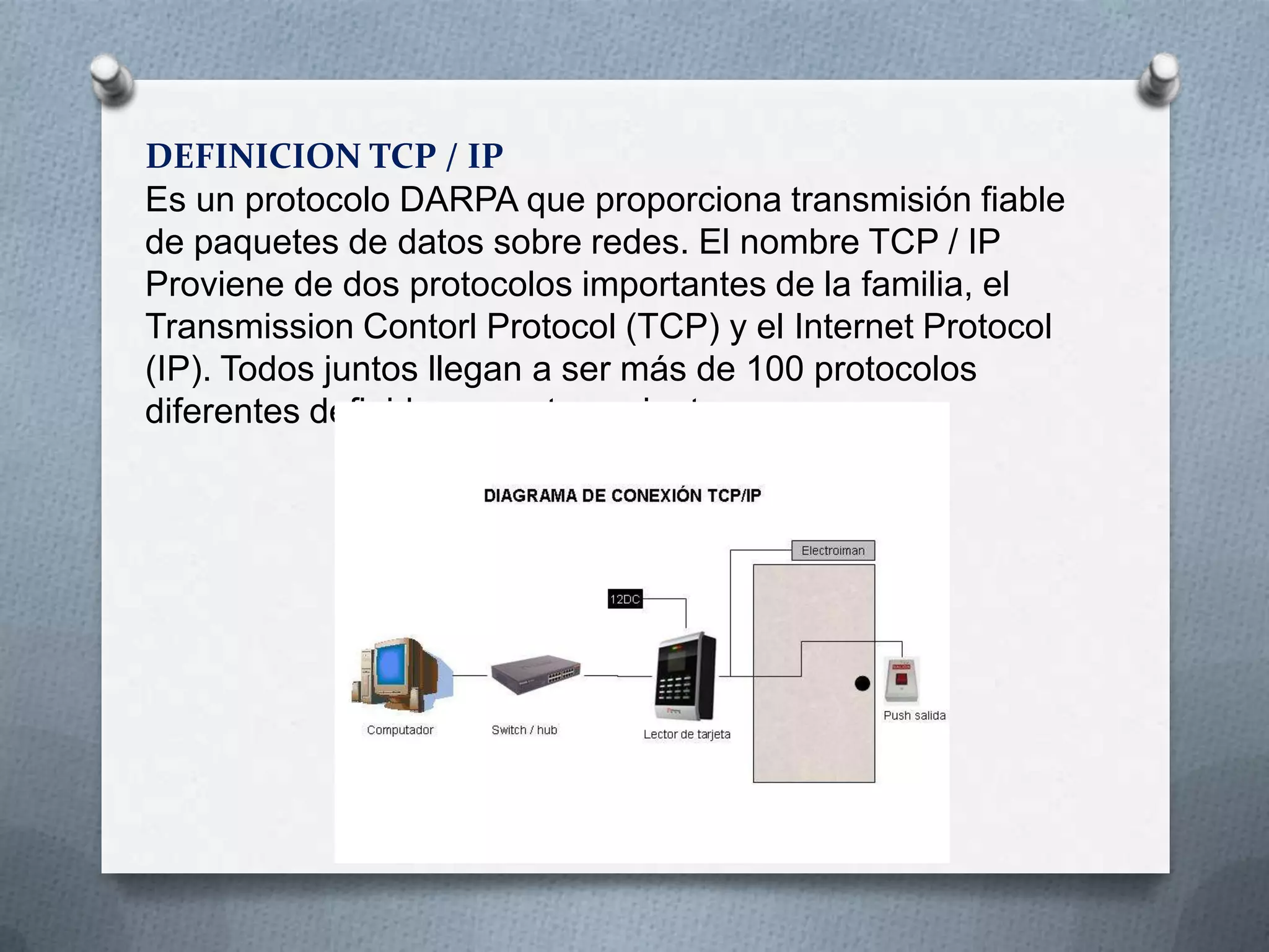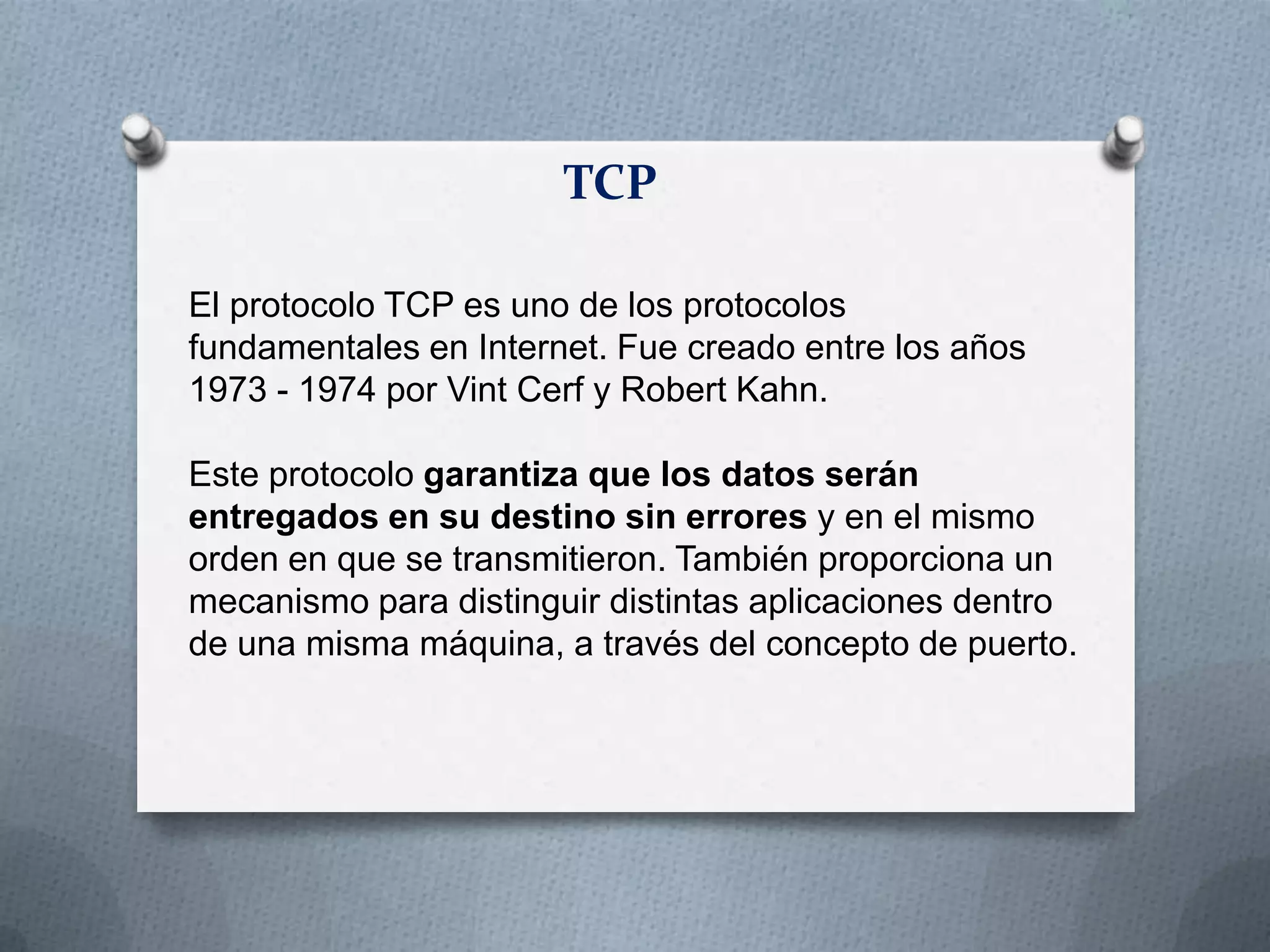 El documento proporciona información sobre el protocolo TCP, incluyendo que fue creado entre 1973-1974 por Vint Cerf y Robert Kahn y garantiza la entrega de datos sin errores y en el orden correcto a través de la identificación de aplicaciones mediante puertos. También describe los comandos y funcionalidad básica de TCP/IP.
