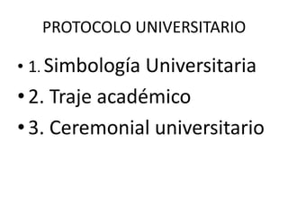 Este documento describe la simbología, el traje académico y el ceremonial de la Universidad Técnica Particular de Loja. Explica que la universidad fue creada en 1971 y ofrece estudios presenciales y a distancia. También detalla la estructura y composición de su Consejo Superior, así como algunas de las ceremonias universitarias más importantes como las incorporaciones y entregas de doctorados honoris causa.