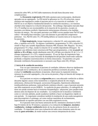 Este protocolo de ventilación mecánica describe los parámetros básicos para iniciar y monitorear la ventilación mecánica de pacientes, incluyendo el ajuste inicial de volumen corriente, PEEP, FiO2 y frecuencia respiratoria. Además, explica cómo evaluar la mecánica ventilatoria monitoreando la presión pico, presión meseta y diferencial de presión, y establece objetivos para estas mediciones para prevenir daño pulmonar. Finalmente, cubre los protocolos de sedación que deben aplic