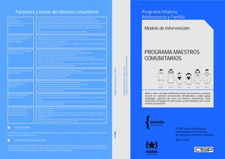 El documento describe las funciones y modalidades de intervención de los Maestros Comunitarios. Los Maestros Comunitarios brindan apoyo pedagógico a niños con bajo rendimiento a través de estrategias de alfabetización en hogares y talleres para padres, así como espacios de aprendizaje e integración en las escuelas. Trabajan de forma coordinada con docentes, familias y la comunidad para mejorar los desempeños educativos de los niños y reducir la deserción escolar.