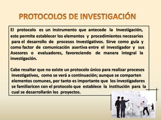 El documento presenta una descripción general de los diferentes elementos que componen un protocolo de investigación. Explica que el protocolo establece los procedimientos y elementos necesarios para el desarrollo de un proyecto de investigación y sirve como guía para el investigador. Además, menciona que no existe un protocolo único y que los investigadores deben familiarizarse con el formato requerido por su institución.