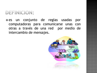 Un protocolo es un conjunto de reglas que permiten la comunicación entre computadoras a través de una red mediante el intercambio de mensajes. Los protocolos más comunes incluyen protocolos punto a punto, protocolos de comunicación entre redes y protocolos de transmisión de paquetes como TCP/IP que dividen la información en paquetes para su envío. Los protocolos definen el formato y secuencia de los mensajes para garantizar la entrega correcta de la información.