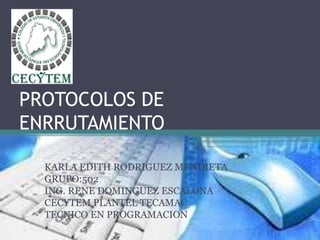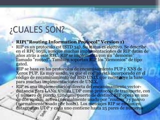 El documento describe varios protocolos de enrutamiento incluyendo RIP, RIP-2 y OSPF. RIP es un protocolo de enrutamiento basado en distancias vectoriales que utiliza UDP como protocolo de transporte. RIP tiene limitaciones como un costo máximo de 16 saltos y carece de autenticación. RIP-2 extiende RIP para permitir máscaras de subred variables, autenticación y etiquetas de ruta. OSPF es un protocolo de estado de enlace más sofisticado que es más adecuado para redes grandes