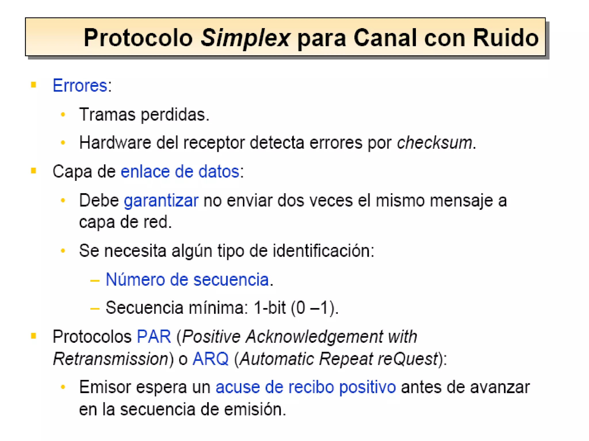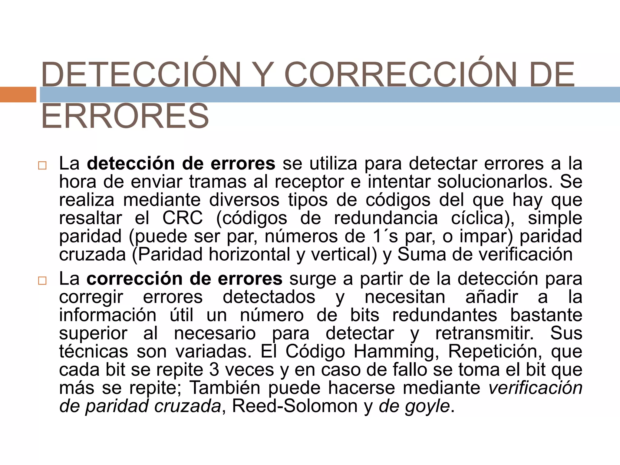 La detección y corrección de errores son métodos utilizados en la capa de enlace de datos para identificar y solucionar errores durante la transmisión de tramas. La detección de errores se realiza mediante códigos CRC, paridad y suma de verificación, mientras que la corrección de errores usa técnicas como códigos de Hamming y repetición para arreglar los errores detectados. Los protocolos de la capa de enlace incluyen simplex sin restricciones, simplex con parada y espera, y protocolos de ventanas desl