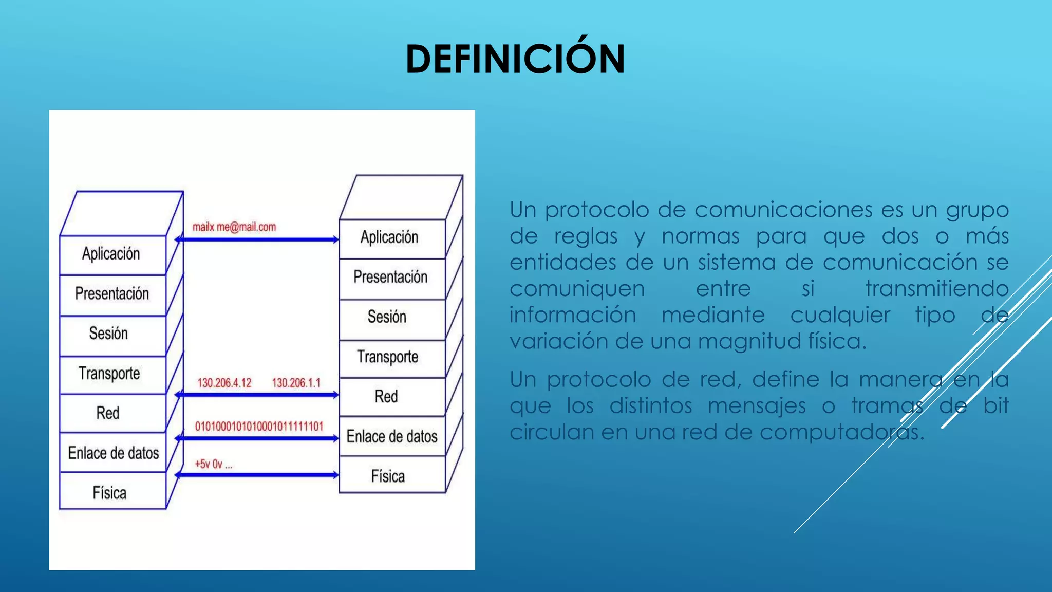 El documento define los principales protocolos de red como IP, TCP, UDP, SMTP, FTP, HTTP, NFS y POP3. Explica brevemente el propósito de cada uno y cómo permiten la transmisión de datos, archivos y correo electrónico entre dispositivos a través de redes de computadoras.
