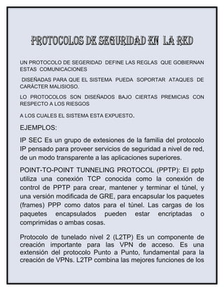 Este documento presenta información sobre protocolos de acceso y seguridad en redes. Explica varios protocolos comunes como IPsec, PPTP, L2TP y SSH que proveen servicios de seguridad a nivel de red de forma transparente. También describe conceptos clave de seguridad informática como software antivirus y firewalls, y presenta un protocolo de acceso para redes de comunicaciones con una estación principal y múltiples estaciones de usuario.