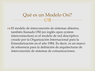 El documento describe el modelo OSI y varios protocolos de red. El modelo OSI es un marco de referencia para definir arquitecturas de interconexión entre sistemas de comunicación. Se describen protocolos como TCP, IP, ARP y otros que operan en las capas de transporte y red del modelo OSI. También se mencionan aplicaciones como Telnet, FTP, SMTP y DNS que utilizan estos protocolos.