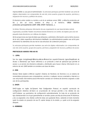 El documento describe los conceptos clave de Active Directory, incluyendo su propósito de almacenar y administrar información de red centralizada, los protocolos que utiliza como LDAP, DNS, DHCP y Kerberos, y la terminología común como bosque, árbol, dominio, sitio y unidad organizativa. Explica que Active Directory permite gestionar los objetos de red como usuarios, grupos y permisos de una manera jerárquica y centralizada.