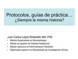 Este documento discute los protocolos y guías de práctica clínica. Explica que su objetivo es mejorar la calidad de la atención mediante la normalización de las actuaciones clínicas basadas en la evidencia. También describe las características que debe tener un buen protocolo, como validez, fiabilidad, claridad y actualización periódica. Finalmente, resume las fases para elaborar un protocolo, que incluyen la preparación, desarrollo del documento, análisis crítico y difusión.