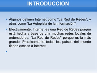 Internet comenzó en 1969 como una red militar estadounidense llamada ARPANET. En la década de 1980 se estableció como tecnología y en 1993 el navegador Mosaic permitió acceder fácilmente a la World Wide Web. Internet funciona a través de protocolos como TCP/IP, HTTP, SMTP y FTP que permiten servicios como correo electrónico, navegación web y transferencia de archivos entre computadoras conectadas a nivel mundial.