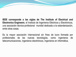 El documento describe los estándares IEEE para redes locales, incluyendo Ethernet, Token Ring y FDDI. Explica cómo la segmentación de redes mediante switches y routers divide las redes en secciones más pequeñas para mejorar el rendimiento al aislar el tráfico y evitar la congestión. La segmentación maximiza el ancho de banda disponible y minimiza las colisiones de datos.