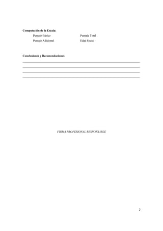 Este documento presenta el protocolo para administrar la Escala de Desarrollo Social de Vineland. Incluye instrucciones para registrar información del examinado, realizar evaluaciones intelectuales previas, computar puntajes en las diferentes categorías y edades sociales, y proveer conclusiones y recomendaciones. Además, contiene una lista de 117 ítems agrupados en categorías que miden habilidades adaptativas para diferentes rangos de edad.