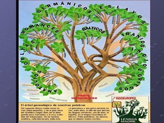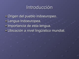 El documento habla sobre el origen del pueblo indoeuropeo y su lengua protoindoeuropea. Explica que el pueblo indoeuropeo vivía originalmente en Europa Central y las estepas de Siberia alrededor de 4000 a.C., y que su lengua madre se reconstruyó a partir de las similitudes entre el sánscrito, griego y latín. También describe las principales ramas en las que se dividió la lengua protoindoeuropea, incluyendo lenguas itálicas, helénicas, germánicas, célticas,