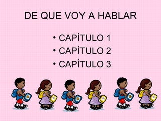 El documento presenta un resumen de una presentación dividida en 3 capítulos. Cada capítulo explora diferentes apartados relacionados con el tema general de la presentación.