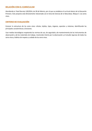 Este proyecto propone que los estudiantes de primaria observen el proceso de descomposición de un animal y monten su esqueleto. Los estudiantes de 10 a 13 años registrarán el proceso de enterramiento, descomposición y extracción del esqueleto en un blog. El proyecto está relacionado con el currículo de ciencias naturales sobre la estructura y funciones de los seres vivos.