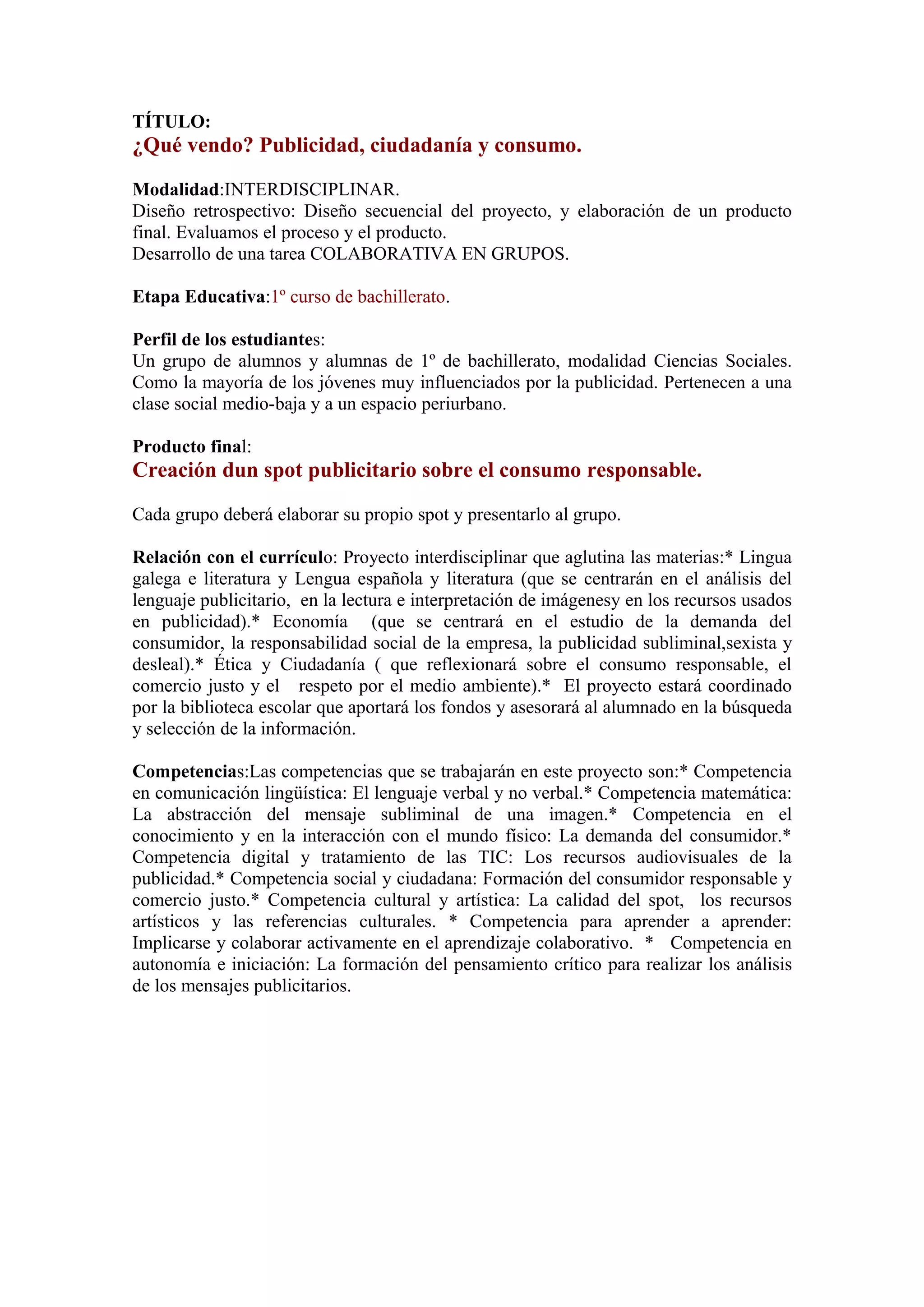 Este documento describe un proyecto interdisciplinar para estudiantes de primer año de bachillerato en España. El objetivo del proyecto es crear un anuncio publicitario sobre el consumo responsable trabajando en grupos. Los estudiantes analizarán el lenguaje publicitario, la demanda del consumidor, y la responsabilidad social y ética del consumo. Cada grupo creará y presentará su propio anuncio. El proyecto involucra varias asignaturas y competencias y consta de las fases de diseño, desarrollo y difusión del