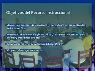 Este documento presenta información sobre el diseño y creación de bases de datos con Microsoft Access. Incluye referencias a temas como diseño instruccional, estrategias de enseñanza a distancia y el uso de nuevas tecnologías en educación. El documento proporciona recursos para el desarrollo de un prototipo digital y cita varias fuentes sobre tecnología educativa.