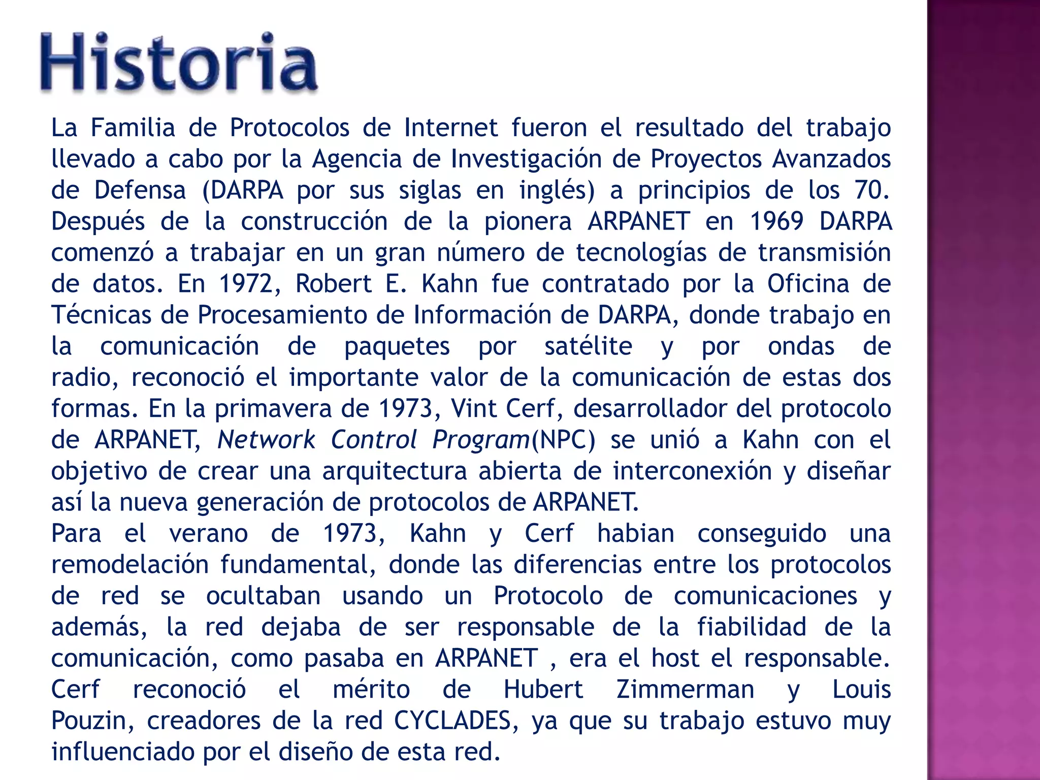 Los protocolos TCP/IP surgieron de la investigación de DARPA en los años 70 para redes de comunicación. Robert Kahn y Vint Cerf desarrollaron un modelo de capas ocultando las diferencias entre protocolos de red y haciendo que las redes solo se encargaran de la transmisión de datos sin garantizar la entrega. Esto permitió comunicar redes heterogéneas y dio lugar al protocolo TCP/IP estándar que se usa hoy en día.