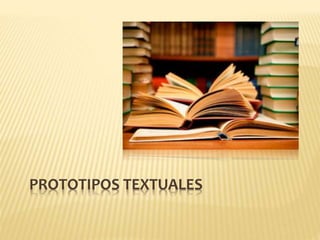 Este documento describe los prototipos textuales y sus características. Explica que los prototipos textuales son las distintas formas en que se pueden clasificar y organizar los mensajes escritos o verbales de acuerdo a su estilo y lenguaje. Luego detalla los principales prototipos como los narrativos, descriptivos, de diálogo, expositivos y argumentativos; y brinda ejemplos de cada uno. Finalmente, incluye enlaces web para más información sobre los prototipos textuales.