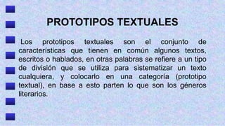 Este documento describe los principales prototipos textuales como la narración, descripción, exposición, argumentación y diálogo. Define cada uno y sus elementos o variantes clave. La narración se vale de verbos y sustantivos para construir historias delimitadas por el tiempo y espacio. La descripción plasma detalles para caracterizar personas, lugares u objetos. La exposición presenta ideas de forma clara y sistemática sin figuras literarias. La argumentación busca persuadir adoptando una idea u opinión. El diálogo es una conversación entre dos o más personas