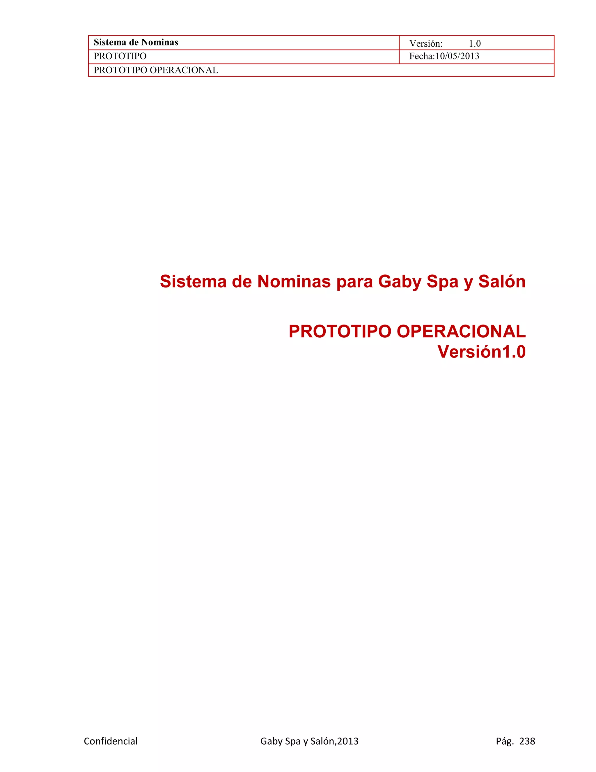 El documento presenta el prototipo operacional de la versión 1.0 del sistema de nóminas de Gaby Spa y Salón desarrollado por un equipo de 6 personas. Incluye la portada, historial de revisiones, y contenido del modelo de diseño aunque este último no es visible en el documento.